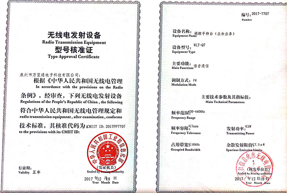 萬(wàn)里通UV5F plus核準(zhǔn)證